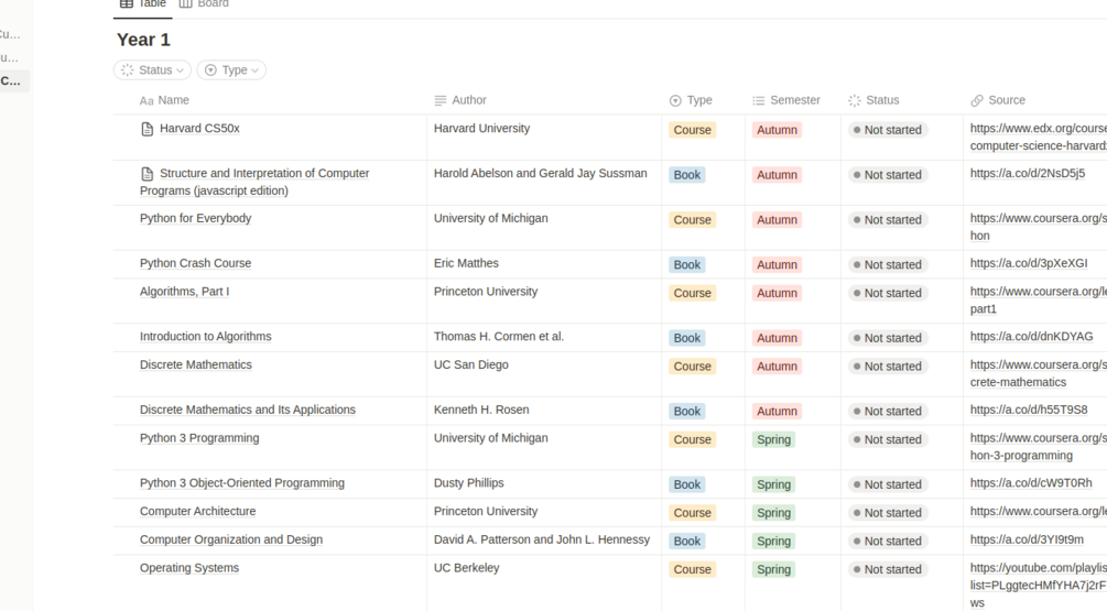 It's a notion template, it has links to online lectures and books on Amazon, approximate cost will be around $2k if you buy all the books and have 3 years of Coursera Plus.